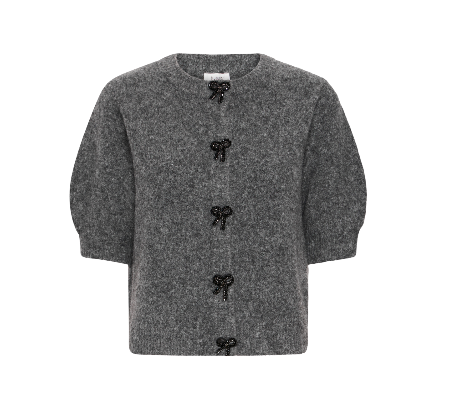 Cardigan sweater with relaxed fit and round neckline. Features half sleeves and decorative bows as button closures. Soft knit offers daylong comfort and versatile styling for any occasion.