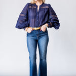 A high-rise cropped flare jean in a dark-indigo wash. Premium stretch denim includes REPREVE, a sustainable, high-performance recycled fiber. Hugs from waistband to knee before extending into a flared cropped leg finished with raw hem. Strategically aged denim highlights top of thigh, creating a slim, sleek line. Classic five-pocket construction and front zip fly closure.