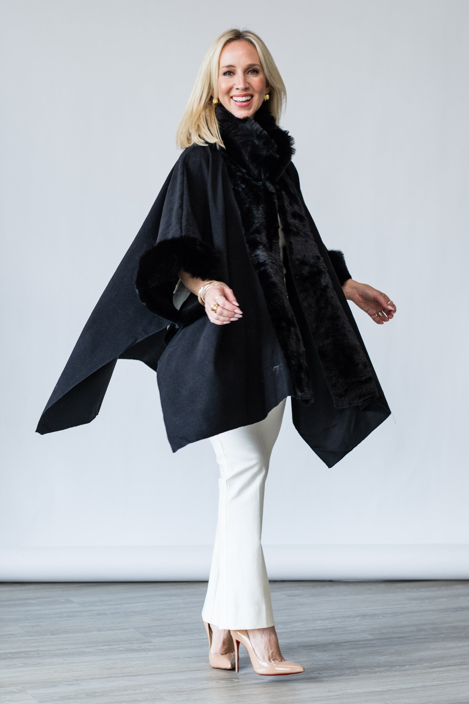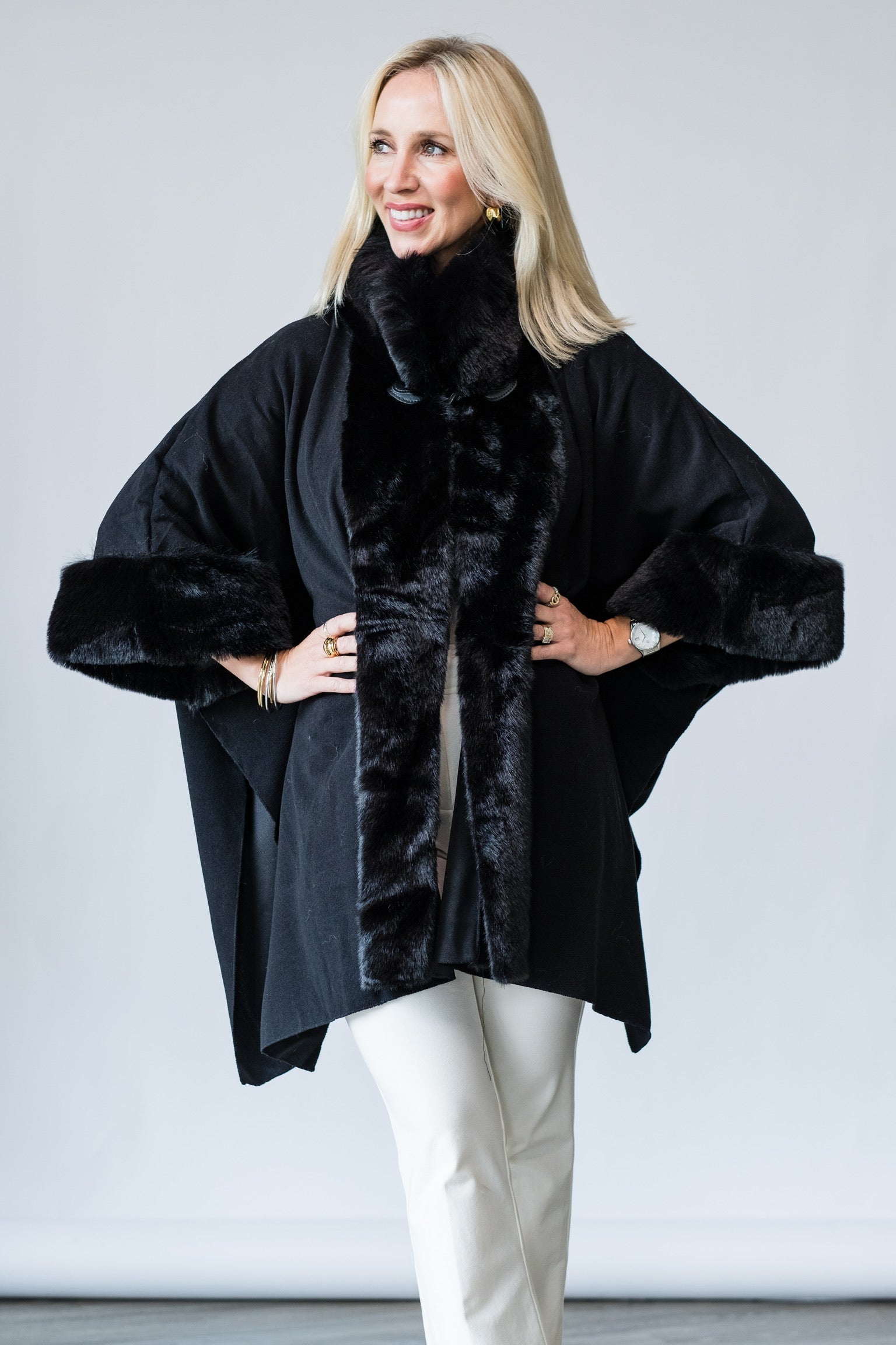 Wrap yourself in sophistication with this elegant black cape, accented by a luxe fur trim. Its flowing silhouette drapes beautifully, offering both warmth and style without compromising on comfort. Whether layered over eveningwear or paired with sleek separates, this statement piece adds instant polish to any look.