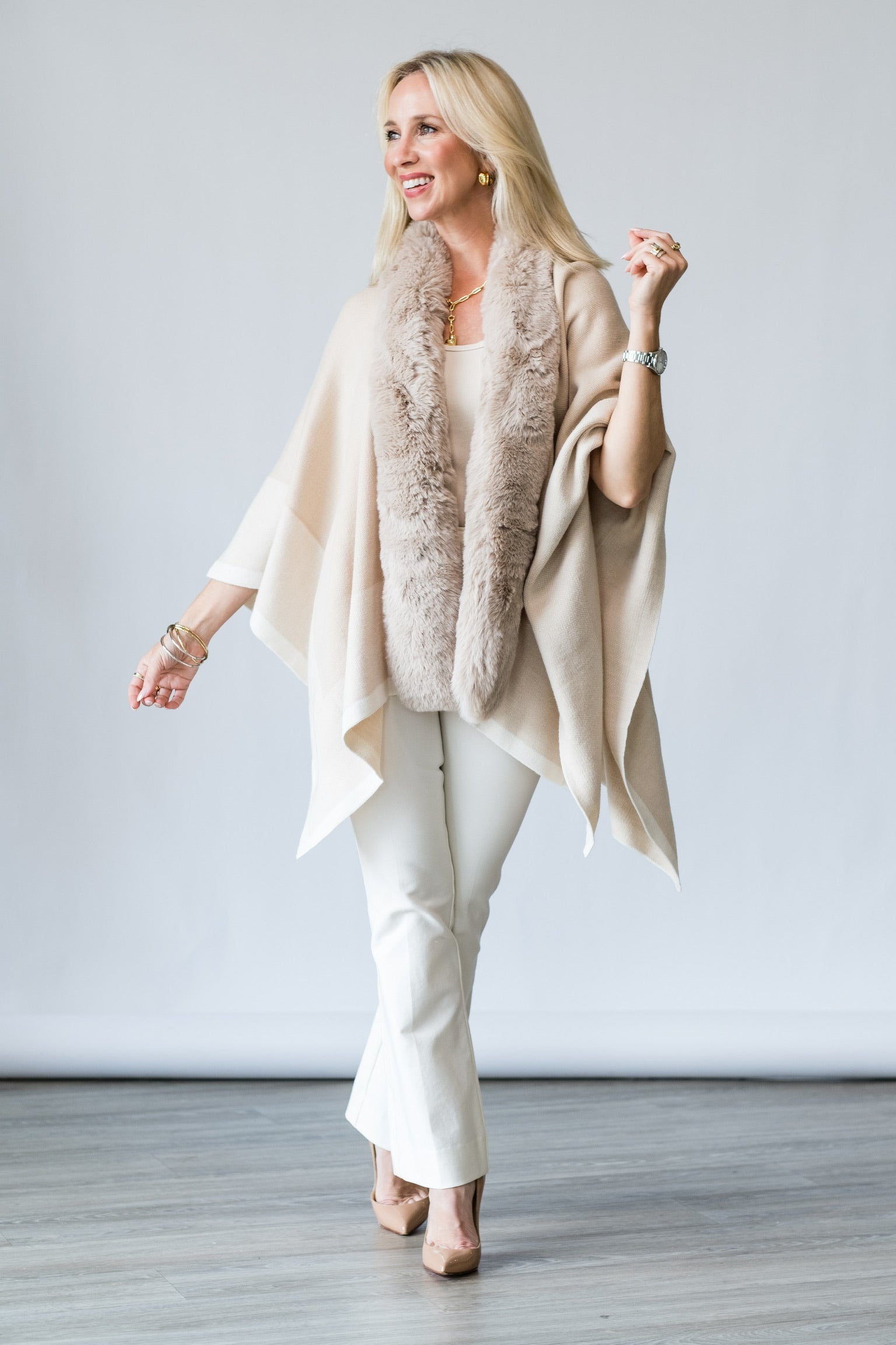 A timeless layer of understated elegance, this beige ruana is trimmed with plush faux fur for a touch of refined luxury. Its draped silhouette offers effortless movement and versatility, making it the perfect piece to elevate both casual and dressy looks. Soft, lightweight, and cozy, it’s the ideal finishing touch for cool evenings or polished daytime outings.