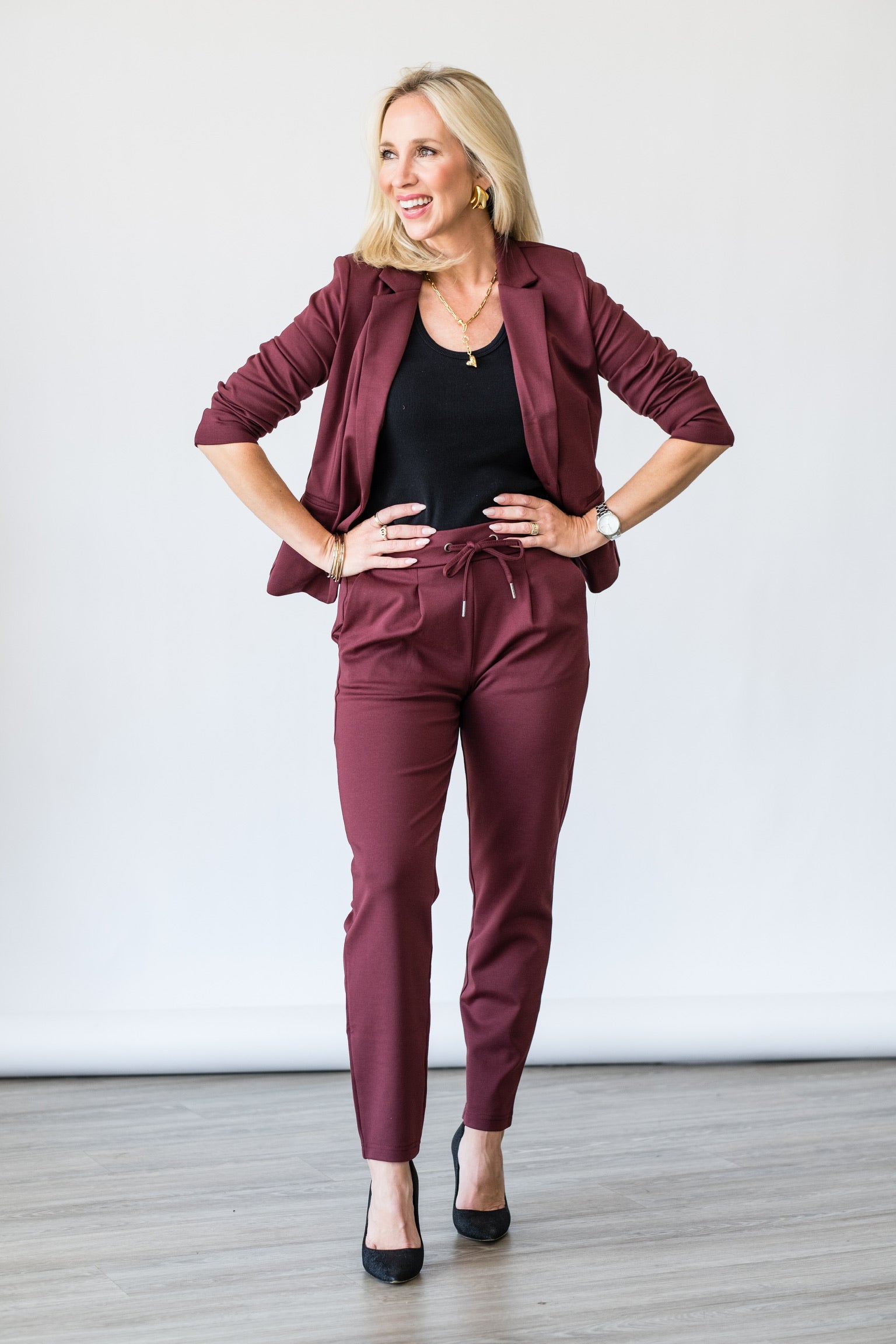 - Ankle bootcut pants with elastic waistband and drawstring.