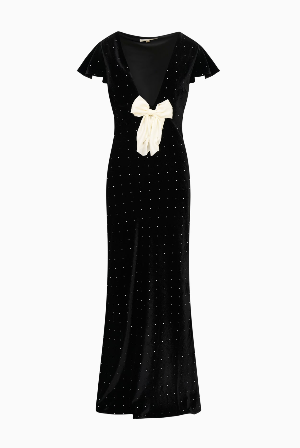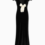 Festive and romantic, the Melora Dress makes its debut. Crafted from velvet with heat-fixed crystals, the dress shimmers subtly across the bias-cut fabric, highlighting its deep V-neckline and vintage-inspired butter sleeves. The empire waist and fishtail skirt create a graceful, flowing shape, while a soft ivory bow at the front neck adds a signature LoveShackFancy accent.