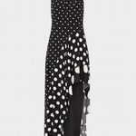 Cut from a combination of three varying polka dot prints, this maxi dress punches up the drama with ruffle details down the front and an exaggerate