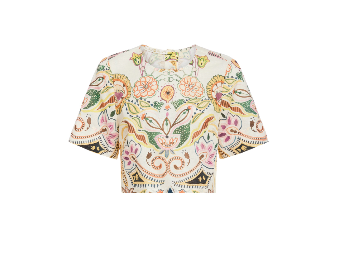 Made for the crop-top devotee, this linen-cotton silhouette pairs a clean, tailored cut with a buttoned back and an artful floral placement print. It captures the ease of vacation on the Mediterranean and looks especially chic with the coordinating high rise, wide-leg Bennett pant in Haven.