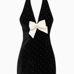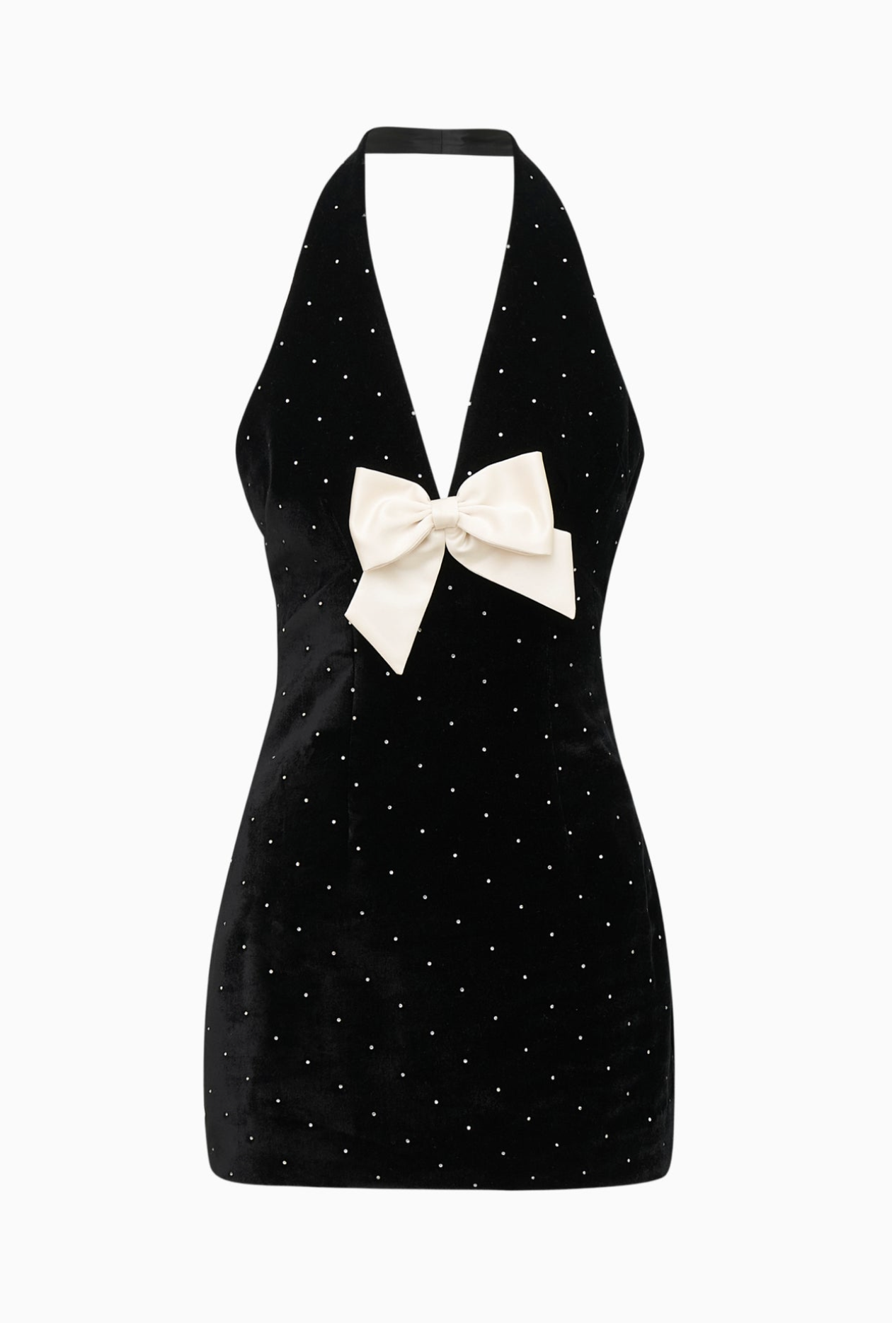 The Kathy Dress is a show-stopping holiday bodycon in festive velvet. Crafted from a velvet fabric adorned with heat-fixed crystals in a dotted, shimmering arrangement, this halter dress features a deep V-neckline, slim fitted silhouette, and low back for striking, elegant drama. Zip up for a sleek finish.