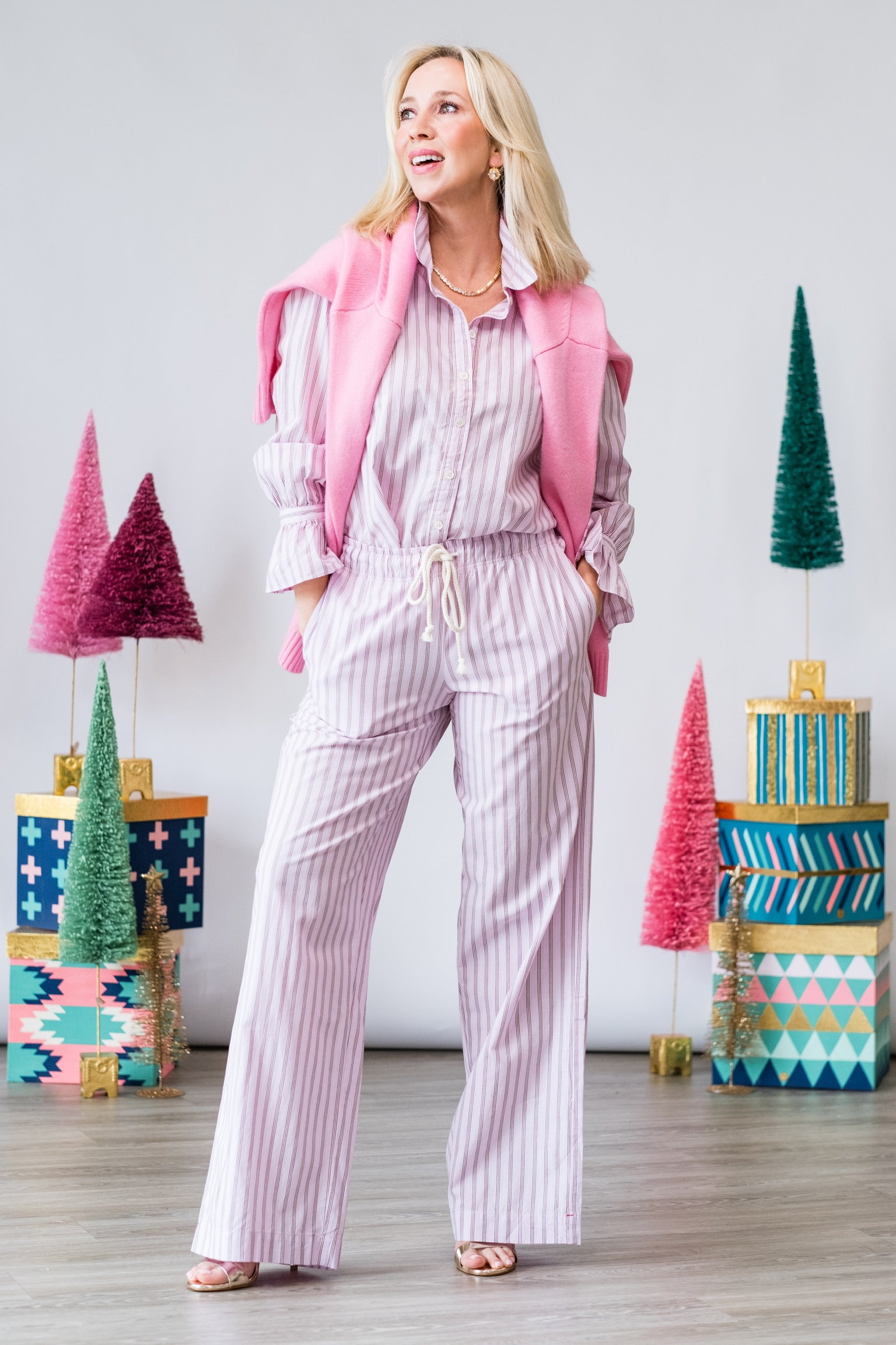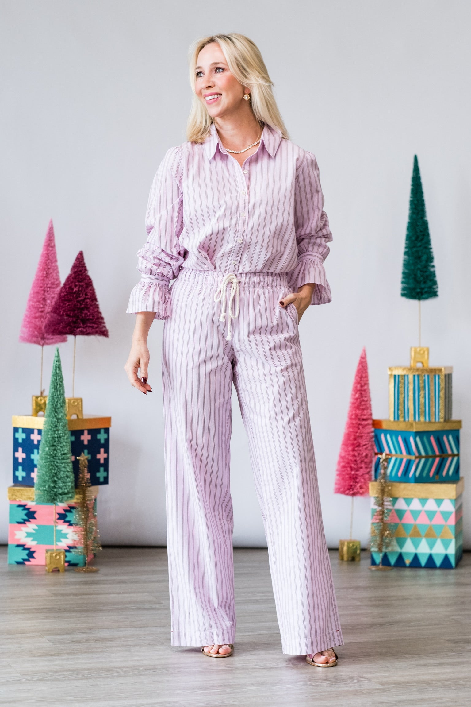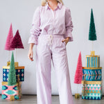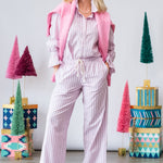The Brinna Pant in Blush Cherry Stripe offers an effortless blend of comfort and sophistication. Featuring a soft drape and a flattering mid-rise fit, these striped pants bring a fresh pop of blush and cherry tones to your wardrobe. Perfect for pairing with simple knits, crisp tops, or matching sets.
