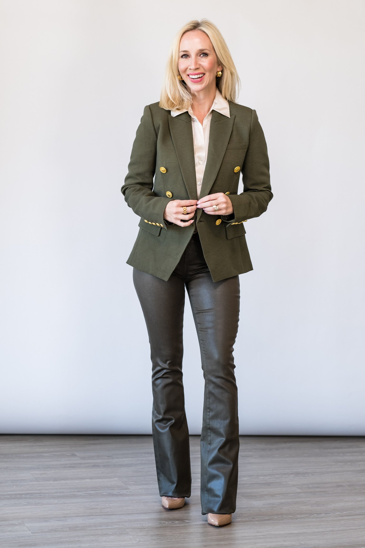 Our super-sculpted Kenzie blazer is a L’AGENCE classic and a bestseller season after season, featuring a tailored slim fit. Now reimagined in a deep olive ribbed fabric that feels as good as it looks. Its sharp double-breasted silhouette is balanced by soft, flexible structure for effortless wear. Gold crest buttons bring standout polish, and flap pockets keep it classic. Dress it down with denim or throw it over your favorite slip dress.