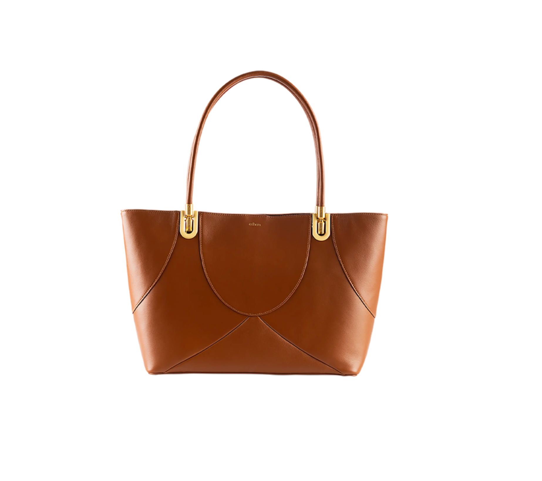 Genuine leather tote bag with sculptural cutouts. Fixed tubular handles are accented with an hourglass-shaped centerpiece, allowing the handles to be inverted for carrying over the shoulder or by hand.