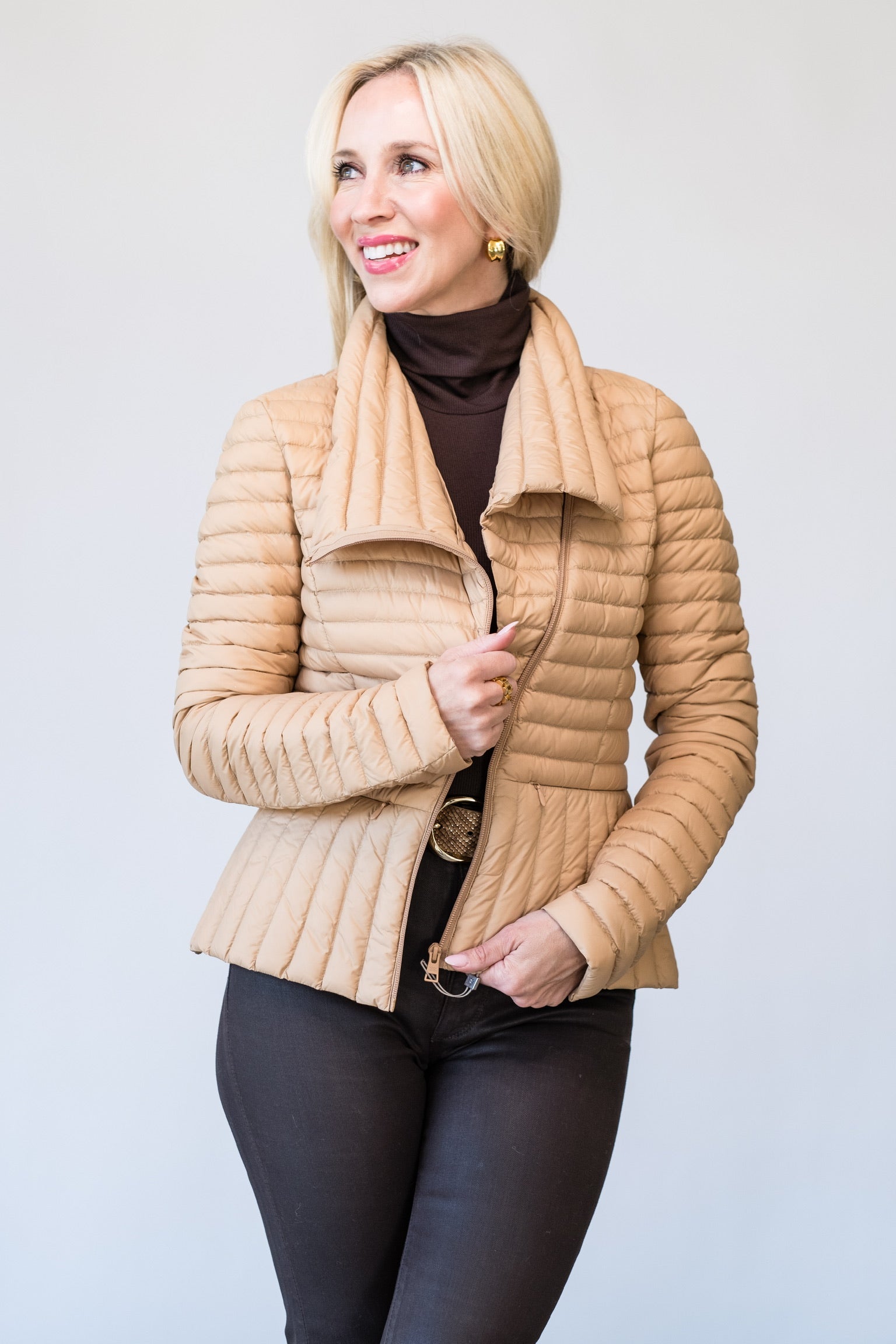 The BRANDY by SOIA & KYO is an ultra-lightweight puffer that packs down into a carrying bag. It’s designed with an elegant crossover collar that flows into an asymmetrical front zipper. The shell is made from 100% recycled nylon and filled with responsibly sourced RDS certified down. Finished with a fashion-forward mix of channel and vertical quilting.