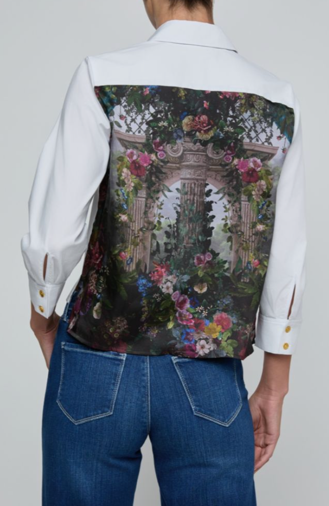 Classic from the front, statement from the back. The Fawn is a white button-down with a striking floral print.
