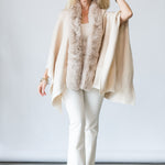 A timeless layer of understated elegance, this beige ruana is trimmed with plush faux fur for a touch of refined luxury. Its draped silhouette offers effortless movement and versatility, making it the perfect piece to elevate both casual and dressy looks. Soft, lightweight, and cozy, it’s the ideal finishing touch for cool evenings or polished daytime outings.